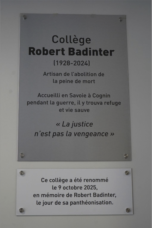 ■ COLLÈGE DE CUINES. Le 9 octobre dernier, le collège de Saint-Étienne-de-Cuines a pris officiellement le nom de Robert-Badinter. Créé le 1er mai 1965, jusqu’à présent, ce collège n’avait aucun nom. L’hommage du département de la Savoie s’est déroulé le jour de l’entrée au Panthéon de l’ancien garde de sceaux connus pour ses combats pour l’abolition de la peine de mort et la dépénalisation de l’homosexualité. Pendant la Seconde Guerre mondiale, Robert Badinter et sa famille avaient trouvé refuge à Cognin dont le maire actuel était présent à Cuines. Pour le département « donner son nom au collège de Saint-Étienne-de-Cuines, c’est aussi faire vivre cette mémoire et rappeler combien la Savoie a pu être, une terre d’accueil et de protection ». Hervé Gaymard, président du département de la Savoie, ainsi que l’ensemble des conseillers départementaux présents, sont intervenus pour rappeler le sens de cet hommage et « l’engagement du département auprès des jeunes générations ». Jacqueline Dupenloup et Pierre-Yves Bonnivard ont assisté à cette cérémonie.